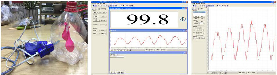【设计意图】:通过传感器,呈现数据动态直观采集过程,再将数据合成图像,学生可清晰的从屏幕中看到气压随时间的变化的关系。通过数学模型的建构,加深了学生对呼吸运动过程中气压变化的理解,更重要的是渗透数学方法,尤其是在这部分数学知识不具备的情况下,将原有知识转化为简单的数学图像,帮助学生理解图像的由来,使学生的图像学习能力和方法得到了提升。