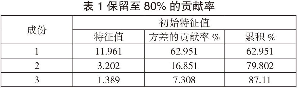 根据主成分的累计方差贡献率达到80%来选取因子。根据这一原则,这19项指标一共提取了3个公共因子(累计方差贡献率为87.11%),三个因子解释能力分别占所有变量总方差的62.951%、16.851%、7.308%。