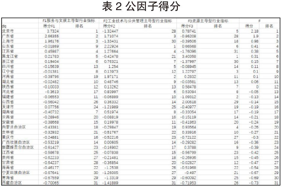 2.公共因子F2在制造业(X3)、电力、热力、燃气及水生产和供应业(X4)、建筑业(X5)、水利、环境和公共设施管理业(X14)、教育业(X16)、卫生和社会工作行业(X17)、公共管理、社会保障和社会组织行业(X19)上的载荷值较大,方差贡献率为16.851%,可以将F2命名为工业技术与公共管理主导型行业指标;