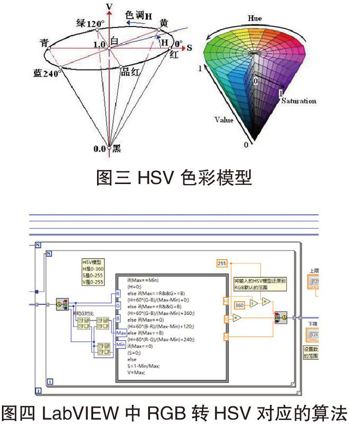 通过for循环结构和颜色至RGB转换控件将像素图的红色、绿色和蓝色进行颜色分离。通过公式节点函数将RGB转换为HSV。HSV即色相(Hue)、饱和度(Saturation)、明度(Value)。色相是色彩的基本属性,就是平常说的颜色的名称,如红色、黄色等。饱和度(S)是指色彩的纯度,越高色彩越纯,低则逐渐变灰,取0-100%的数值。明度(V),取0-max(计算机中HSV取值范围和存储的长度有关)。HSV颜色空间可以用一个圆锥空间模型来描述。圆锥的顶点处,V=0,H和S无定义,代表黑色。圆锥的顶面中心处V=max,S=0,H无定义,代表白色。RGB颜色空间中,三种颜色分量的取值与所生成的颜色之间的联系并不直观,通过颜色的转换将面部特征颜色从北背景中提取出来。