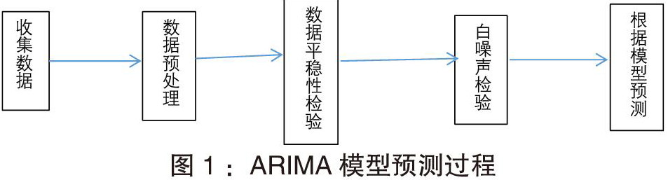 在建立模型时先对所获取的数据进行预处理,然后对数据做平稳性检验。通常采用ADF检验(单位根检验),如果序列中存在单位根说明该时间序列为非平稳序列,要进行平稳化处理,采用取对数或者差分的方法进行处理。处理后再次用ADF检验法对处理后的时间序列进行检验,如果未通过检验,则继续对数据进行处理,若通过检验则进入下一步白噪声检验。如果最终分析的时间序列残差通过白噪声检验,说明信息已经提取完毕,模型建立完成。具体过程如图1所示: