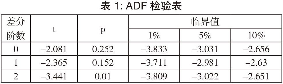 从图2可以看出义乌社会消费品零售总额呈逐年增长的趋势,2020年受疫情影响,社会消费品零售总额有所回落。从总体去上看,可以从初步判定该时间序列是非平稳时间序列,为了进一步确定该时间序列的平稳性,进行ADF检验。检验结果如表1所示: