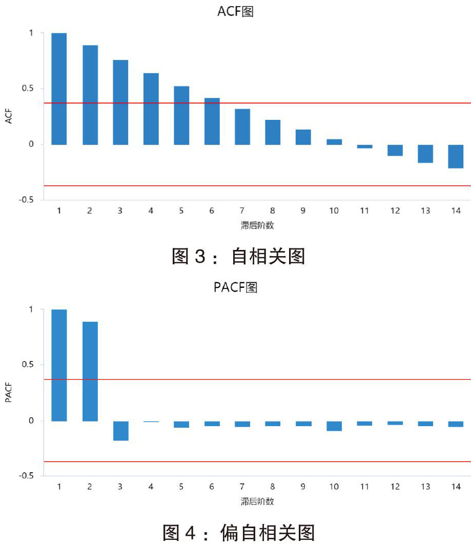 经过处理的义乌社会消费品零售总额时间序列自相关(ACF)与PACF(偏自相关)图如图3、图4所示。