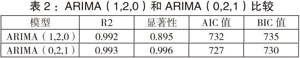 从ACF图和PACF图可以看出,可以选取ARIMA(1,2,0)和ARIMA(0,2,1)对所研究时间序列的拟合效果较好,可以通过拟合优度、显著性检验、AIC值和BIC值(AIC值、BIC值取值越小越好)来选取其中一个模型作为最终预测使用的模型。两个模型具体比较情况如表2所示: