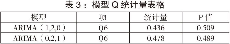 此外,还要构建Q统计量对模型进行白噪声检验。通常情况下可以直接针对Q6进行分析,也就是检验残差前6阶自相关系数是否满足白噪声,通常其对应p值大于0.1则说明满足白噪声检验(反之则说明不是白噪声)。两个模型的Q检验结果如表3所示: