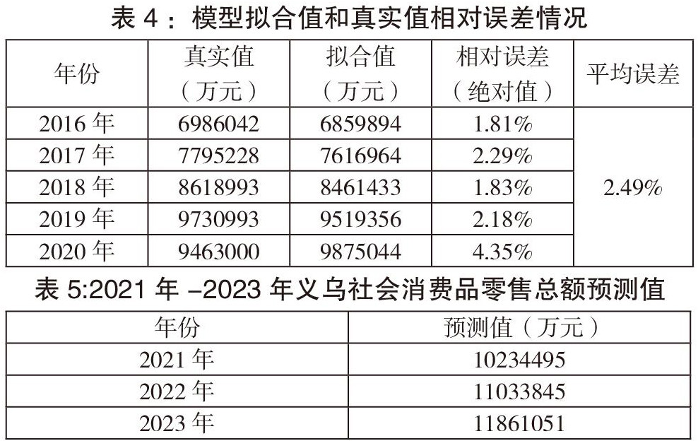 为了进一步对模型的拟合效果进行评价,本研究选取2016年-2020年共五年的数据进行分析,计算实际值与拟合值之间的相对误差,并计算平均误差值,以此检验模型的评价效果,具体结果如表4所示。从表4数据可知,模型误差率比较低,平均误差为2.49%。2020年由于受疫情影响,属于突发事件,是不可控因素,因此模型拟合值与真实值之间误差较大。根据模型预测2021-2023年的义乌社会消费品零售总额如表5所示:
