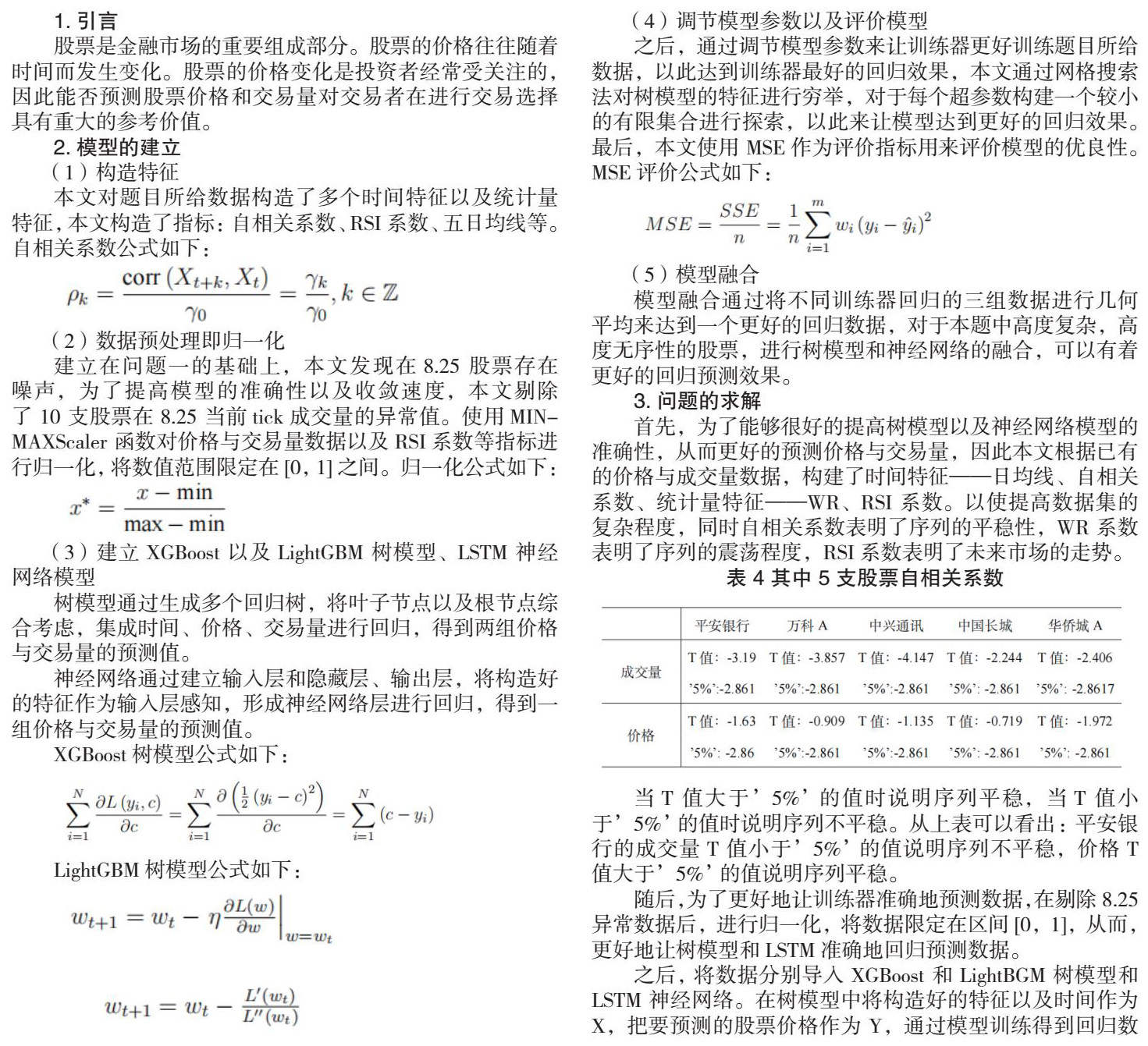 通过XGBoost、LightGBM和LSTM对十只股票30个tick _time的价格和交易量的预测,构建了时间特征日均线、自相关系数、统计量特征、WR、RSI 作为其特征。最后通过简单加权平均融合,用融合后的数据作为价格与交易量的预测并且本文计算出来的MSE偏小,验证了本文模型的准确性。综上所述,这有利于交易者进行交易的时候做出合理的选择。