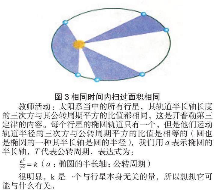 教师活动:教师引导学生对地球绕日轨道进行观察,并阐述:在相同时间内,太阳与地球的连线在相同时间内扫过的面积是相同的(如图3所示),那么地球在靠近和远离太阳时运行速度是不一样的,在近日点时速度大、远日点时速度小,这就是开普勒第二定律。