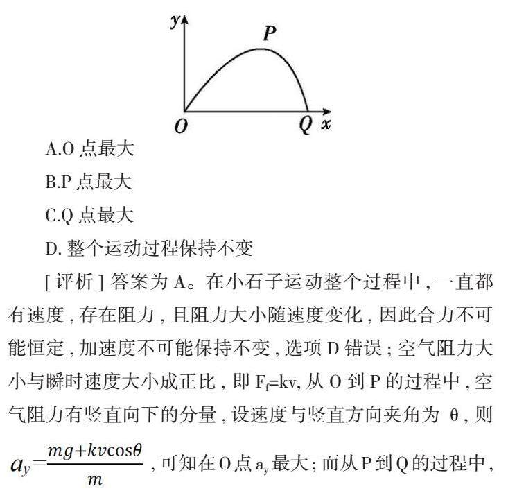 [评析] 答案为A。在小石子运动整个过程中,一直都有速度,存在阻力, 且阻力大小随速度变化, 因此合力不可能恒定,加速度不可能保持不变,选项D错误; 空气阻力大小与瞬时速度大小成正比, 即Ff=kv,从O到P的过程中,空气阻力有竖直向下的分量,设速度与竖直方向夹角为θ, 则, 可知在O点ay最大; 而从P到Q的过程中,空气阻力有竖直向上的分量,根据,可知在P处ay最大, 综上可知, 小石子从O到Q的整个过程,在O点竖直方向分运动的加速度最大, 选项A正确, B、C错误.