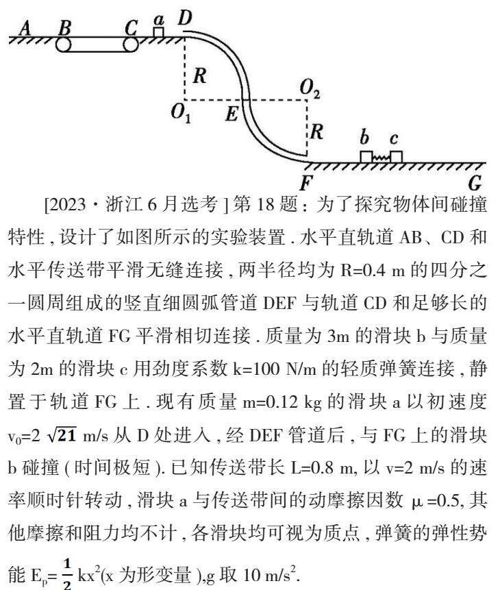 [2023·浙江6月选考]第18题: 为了探究物体间碰撞特性,设计了如图所示的实验装置.水平直轨道AB、CD和水平传送带平滑无缝连接,两半径均为R=0.4 m的四分之一圆周组成的竖直细圆弧管道DEF与轨道CD和足够长的水平直轨道FG平滑相切连接.质量为3m的滑块b与质量为2m的滑块c用劲度系数k=100 N/m的轻质弹簧连接,静置于轨道FG上.现有质量m=0.12 kg的滑块a以初速度v0=2m/s从D处进入,经DEF管道后,与FG上的滑块b碰撞(时间极短).已知传送带长L=0.8 m,以v=2 m/s的速率顺时针转动,滑块a与传送带间的动摩擦因数μ=0.5,其他摩擦和阻力均不计,各滑块均可视为质点,弹簧的弹性势能Ep=kx2(x为形变量),g取10 m/s2.