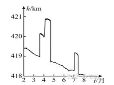 [2021年6月浙江选考第10题,单选] 空间站在地球外层的稀薄大气中绕行,因气体阻力的影响,轨道高度会发生变化。空间站安装有发动机,可对轨道进行修正。图中给出了国际空间站在2020.02-2020.08期间离地高度随时间变化的曲线,则空间站( )