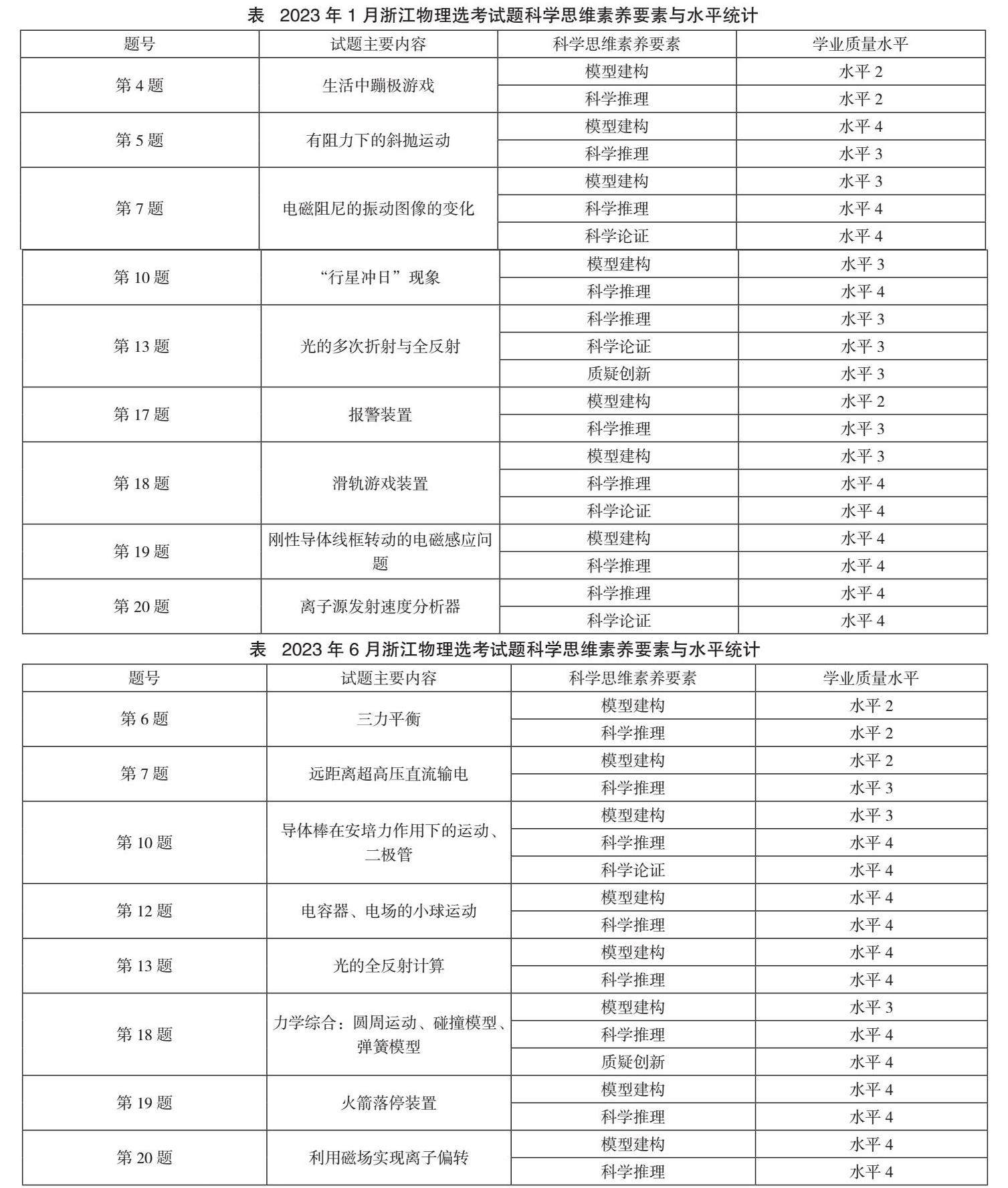 根据《课标》下面对2023年1月和6月浙江省物理选考试题从科学思维进行分析,梳理涉及思维要素与学业质量水平。
