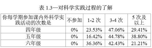 结合对科学教师的访谈得知,学校非常重视对学生科学实践能力的培养,对学生科学实践相关知识的掌握程度也十分关注。由表1.3可知,每个年级段的学生都在一学期内参加了科学实践活动,大部分参与次数都达到了3次及以上。这些活动为学生提供了良好的培养科学文化素质的环境。