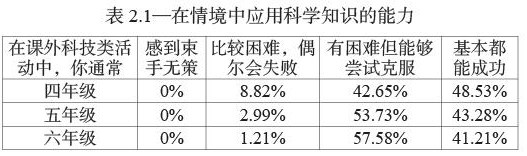 科学教学的形式主要是通过让学生亲身参与科学实践活动从而提升学生的科学能力。如表2.1所示,基本上所有的学生都能在课外科技类活动中熟练地应用科学知识,即使碰到困难也能够运用各种方法去克服,说明学生在各类情境中应用科学知识的能力还是比较强的。