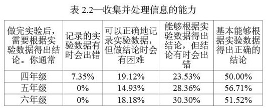 在科学探究的过程中,根据信息得出结论的能力十分重要。如表2.2所示,只有约半数的学生基本能够根据实验数据得出正确的结论,有7.35%的四年级学生尚不能正确地记录实验数据。近一半的学生在根据记录的实验数据得出结论时会碰到困难,可见学生具备收集信息的能力,但缺乏处理信息的能力。