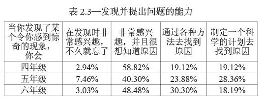 从纷繁复杂的信息源中发现并提出值得思考与探究的问题的能力是科学探究的第一个步骤。如表2.3所示,当学生发现了某个感到惊奇、想要探究的现象时,大部分学生非常感兴趣,并且很想知道原因。但想要去找到原因的学生在四、六年级均未超过半数,能够制定一个科学的计划去找到原因的比例较低。可见学生在日常生活中具备发现发现问题的能力,也有着探究问题的好奇心,但缺乏根据问题提出一个科学的探究计划的能力。