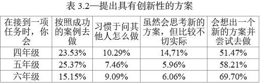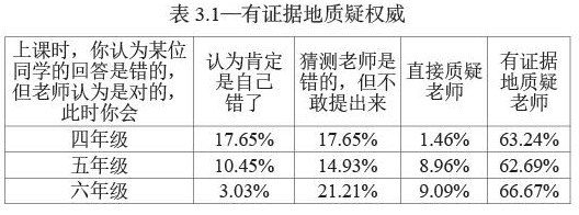 不轻易迷信权威的学生,敢于突破和创新,更懂得表达自己的意见。如表3.1所示,在四、五、六年级的学生中,均有超过60%的学生表示当上课认为老师是错的时,会有证据地质疑老师。并且,学生独立思考的能力会随着年级的增长呈正比例发展。高段的学生更具有批判精神和怀疑精神。
