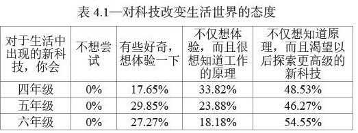 如表4.1所示,对于生活中出现的新科技,没有学生持排斥的态度,说明学生对科技的接纳度是很高的。不仅如此,学生还对新科技表现出了极高的探索的欲望。在四、五、六年级中,分别有48.53%、46.27%和54.55%的学生表示不仅想知道新科技的原理,而且渴望以后探索更高级的新科技。这表现了学生对新科技有着非常强烈的探究欲,可以通过开发新科技的研究主题,激发学生对科学探究的兴趣。