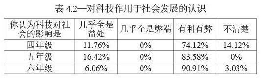 科技、社会与环境三者之间的关系随着人类社会不断发展、科技不断进步而带来了新的矛盾与冲突。如表4.2所示,没有学生选择几乎全是弊端的选项,可见学生对科技给社会带来的益处还是比较明确的。然而,在四、五、六年级中,分别有11.76%、16.42%和6.06%的学生选择了几乎全是益处的选项,另有14.12%的四年级学生和3.03%的六年级学生对科技作用于社会的影响并不清楚,这说明有少部分的学生对科技带来的弊端不是很清楚。