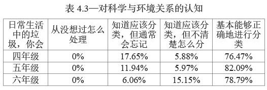 青少年对科技、社会与环境的认识主要来源于日常生活。如表4.3所示,在四、五、六年级学生中,基本能够正确地对日常生活中的垃圾进行垃圾分类的学生所占比例很高。说明学生熟知环境保护的相关知识。这与杭州市政府推行的垃圾分类制度有着密切关系。然而,在提升学生科学素质的过程中,仍需加强对环境与资源知识科普的重视。