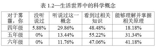本题考察的是学生对雾霾这一比较常见的科学概念的掌握程度。由表1.2可知,在四、五、六年级中,分别只有18.18%、31.34%及41.18%的学生能够理解并掌握雾霾的相关原理,可见多数学生对于日常生活中的科学概念只是处于听说过或看到过相关知识的阶段,而并不能够完全理解科学概念及其原理。这可能是因为学生还是缺乏对科学概念进行深入理解的想法。