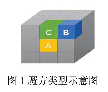 首先,我们知道魔方是由一些小方块连接在一起组成的一个大立方体。大立方体有六个面,每个面都是由9个小方格组成的一个平面。如下图1所示,其中,A代表中心 块,B代表角块,C代表边块。