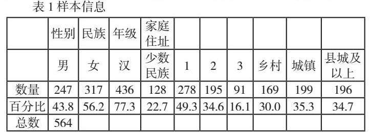 本研究采用方便抽样的方法,选取564名不同省份高中生作为研究样本,通过问卷星展开调查研究。其中汉族436名,少数民族128名,农村169人,城镇199人,县城及以上196人;男生247名,女生317名;高一278人,高二195人;高三91人(详情见表1)。