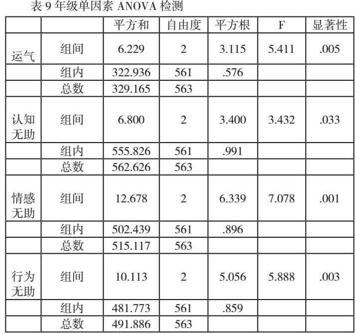 表9是具有显著差异的因子变量在年级上的单因素方差分析。首先,如表9和表10所示,三个年级在运气归因方面存在显著差异,其显著性为0.005。此外,二年级的均值(M=3.11)最高,三年级的均值最低(M=2.80),一年级的均值(M=2.99)介于两者之间。其次,认知无助具有0.033的显著差异。其中二年级均值(M=2.75)最高,其次是一年级(M=2.64),三年级最低(M=2.42)。第三,情绪无助显著性差异为0.001,二年级的均值(M=2.99)最高,三年级的均值(M=2.56)最低。最后,在显著性水平0.003的情况下,发现了行为无助感方面的显著差异。均值由高到低排列分别是二年级(M=2.92)、一年级均值(M=2.87)、三年级(M=2.53)。