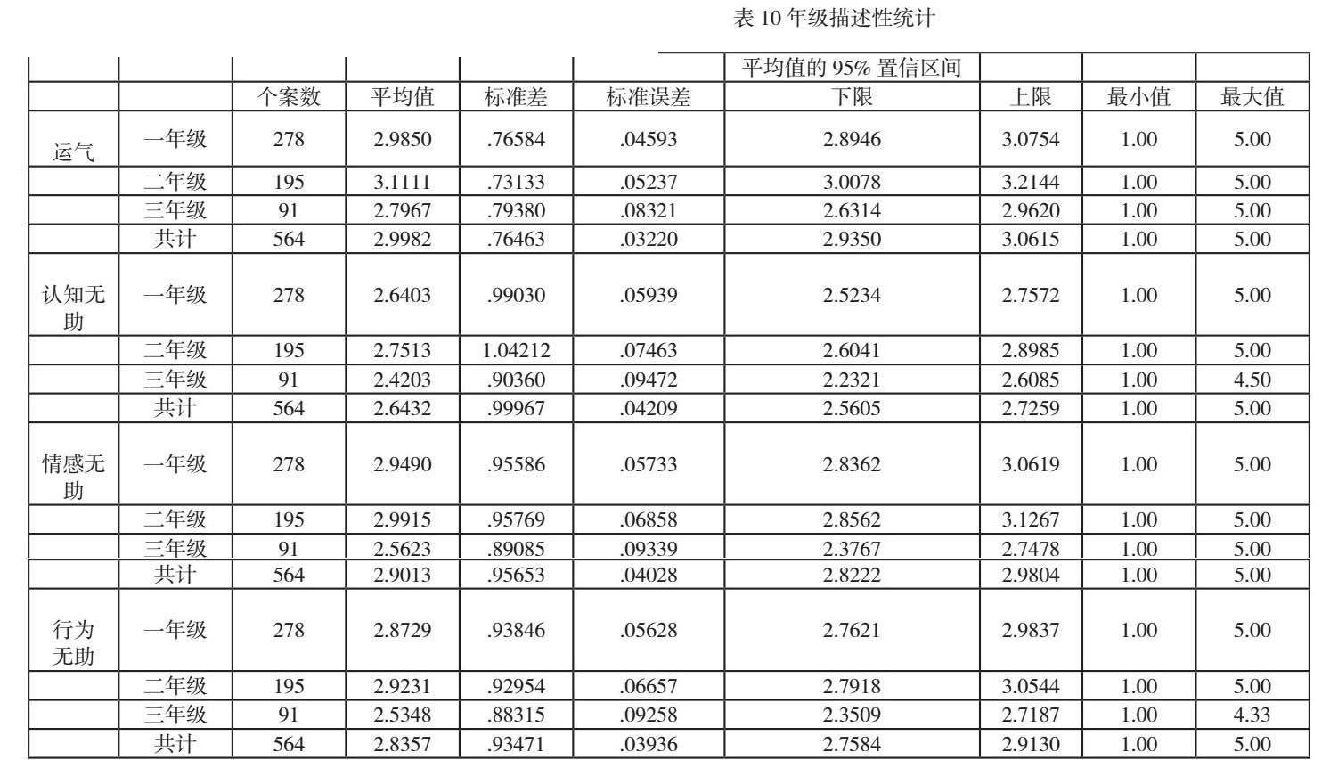 人口变量分析表明男生在学习中更加无助,倾向于将成功归因于运气,女生则更多地归因于努力、能力与学习情境。习得性无助和家庭住址显著相关,经济条件和教育环境落后的学生更无助,如乡村学生的无助感大于县城学生。从年级来看无助程度,高二年级最无助,高一年级次之,高三年级作为高考冲刺阶段,无助感反而最低。