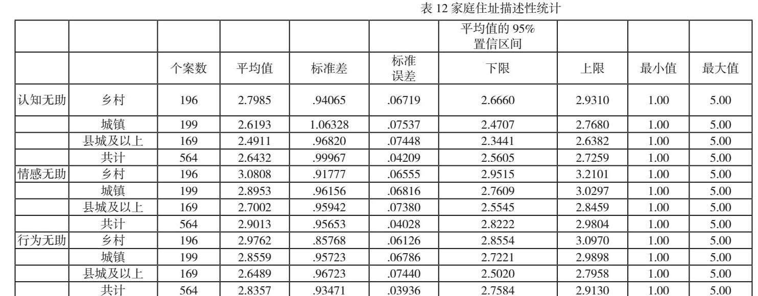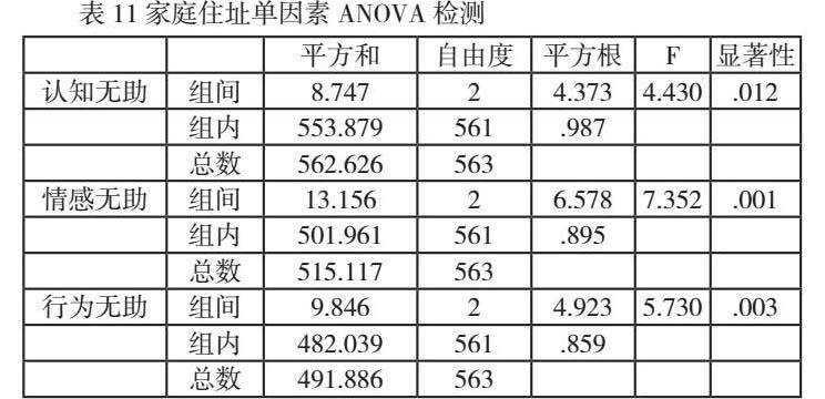 表11是家庭住址对具显著差异的因子变量的单因素方差分析。如表11所示,家庭住址在认知无助、情感无助、行为无助上均存在显著差异,P值分别为0.012、0.001、0.003.在认知无助上,得分高低的排列依次为乡村、城镇、县城及以上(M=2.80,M=2.62,M=2.49);情感无助和行为无助分别是乡村(M=3.08)、城镇(M=2.90)、县城及以上(M=2.70)与乡村(M=2.98)、城镇(M=2.86)、县城及以上(M=2.65)。由以上数据可以看出来自乡村的学生最无助,其次是城镇学生,县城以上学生无助感最低,原因可能是受到经济条件、生活水平以及教育质量的影响,导致不同地区学生的心理状态发生了相应的变化,尤其是农村地区发展落后,留守儿童比较多,所以情感上也会更无助一些。城里的父母更有可能受过良好的教育,可以在英语方面给孩子提供指导。城乡教育资源分布不均,与乡镇学生相比,城市学生拥有更丰富的的资源,如外教、培训班和多媒体课程。由于他们的家庭背景和成长环境不同,在面对英语学习的困难和挫折时,也会有不同的情绪表达和行为(谭鑫,2019)[7]。