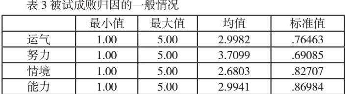 表3显示了成败归因各项因子的均值和标准差。如表3所示,努力因素的平均值最高(平均值=3.71,标准差=0.69),情境因素的平均值最低(平均值=2.68,标准差=0.83)。运气和能力的平均值介于两者之间(平均值=3.00,标准差=0.76;平均值=2.99,标准差=0.87)。