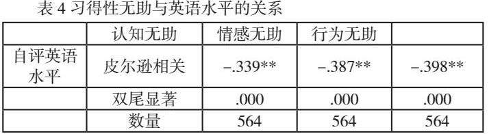 表4展示了自评英语水平与习得性无助三个因子之间的皮尔逊相关关系。如表4所示,自评英语水平与情感、行为与认知因素均呈显著负相关,尤其情感和行为两个因子,相关度较高。这表明,英语学习无助感严重影响了英语学习效果。这些学生在学习英语时越无助,他们的英语成绩就越差,杨婧(2015) 对陕西某高一年级的无助问卷研究也印证了这一点。