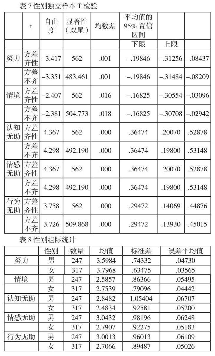 表7是受试者性别对学习无助和成败归因具有显著差异的独立样本检验结果。首先,如表7和表8所示,性别在努力和情境方面P值都小于0.05,说明存在显著差异,且两个因子的均值女性均大于男性(M女3.80>M男3.60;M女2.75>M男2.59)。第二,在认知无助方面发现0.00的显著性差异,其显著性小于0.01,男性的平均分(M=2.85)高于女性组(M=2.48)。第三,在显著性水平0.00下,情感无助在性别上存在显著差异,男性组的无助程度(M=3.04)高于女性组(M=2.79)。最后,在行为无助方面,男性和女性存在0.00的显著差异,男性组的均值(M=3.00)依然高于女性组(M=2.71)。