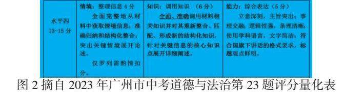 2023年广州市中考道德与法治的第23题的评分量化表根据新结构教学评框架进行优化升级,如下图: