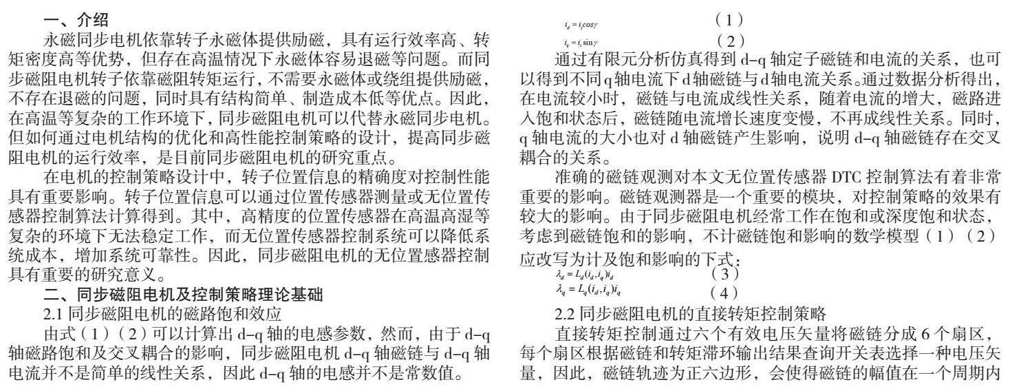 摘要:同步磁阻电机作为一种新型电机,具有制造简单、成本低、效率高等优势,近年来获得关注,在高效传动、电动汽车等领域具有广泛的应用前景。同时,无速度传感器在降低系统成本,减少传感器体积等方面已成为学术热点。
