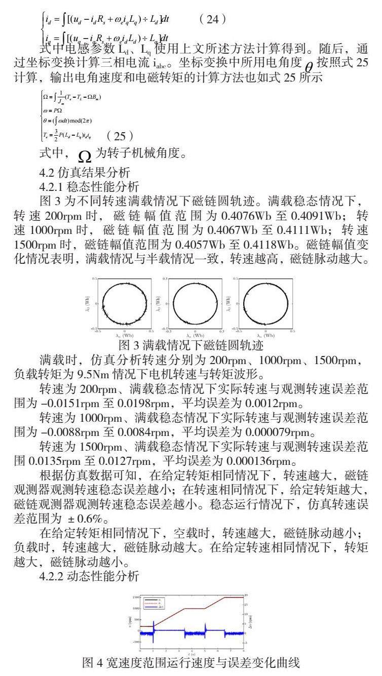 在动态转速响应性能分析中,负载转矩为0,速度给定为斜坡给定,在磁链观测器观测转速闭环阶段,给定转速以斜坡加速度330rpm每秒依次加速到1000rpm和1500rpm。图4为电机输出转速n和磁链观测器输出转速以及两者的误差的曲线。由于转速计算环节的PLL锁相环带来的转速滞后,电机在加速的动态过程中,约有2-3rpm的误差,但该误差在可接受范围内。在稳态时,转速稳态误差为0,与前文分析结果一致。