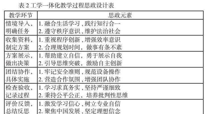 在完成课程标准校本转化后,首先要对课标中的学习任务工作流程、内容、要求、成果、劳动组织关系等工作过程进行学习任务分析。然后根据学习任务分析表制定教学活动策划表,并把握好可行性、融合性、代表性原则。自动化设备控制系统的安装与调试思政内容融入举例以交通信号灯控制系统的安装与调试为例,如表2工学一体化教学过程思政设计表所示。
