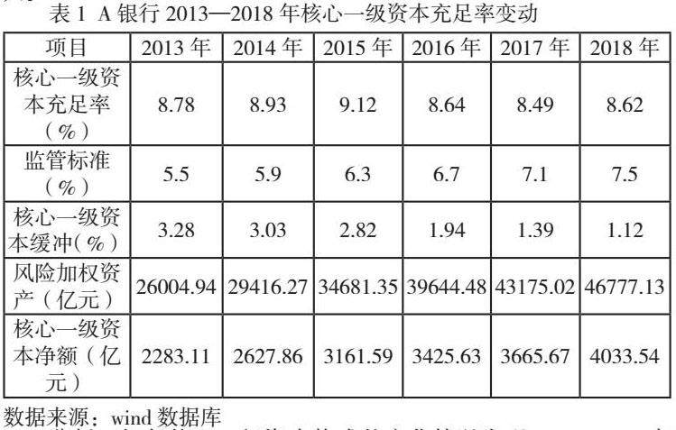 分析A银行核心一级资本构成的变化情况发现,2013-2018年间A银行的核心一级资本净额增幅为176.67%;风险加权资产增幅为179.88%;后者的增幅大于前者,这说明A银行核心一级资本缓冲下降是该银行扩充资产规模和监管要求逐年提高共同作用的结果。