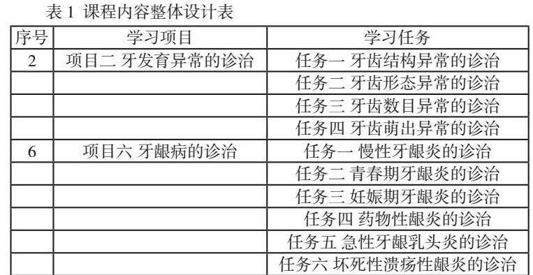 根据与行业一线专家共同分析高职高专口腔医学专业毕业生在完成口腔内科岗位实际工作任务所需要的素质、知识、能力要求及未来工作发展需要,以口腔内科典型工作任务为主线,融入相应的思政元素,对课程内容进行重新排列与优化组合,并与最新的国家口腔执业助理医师资格考试大纲相接轨,本课程设计了13个学习项目、共46个学习任务。以项目二和项目六为例,具体内容见表1。