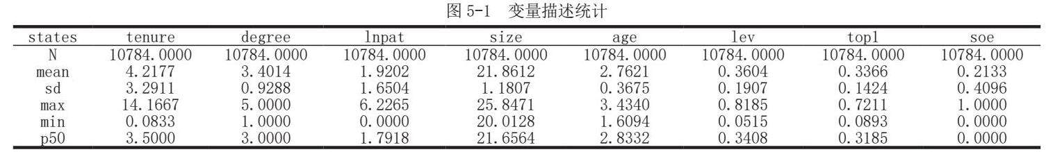 选取上市公司ceo的任期年限,一般而言,当管理者任期较长时,他们在组织中的稳定性和连续性增加。这种稳定性和连续性有助于建立和维护一种创新友好的工作环境。促进创新文化的建设,提供持续的资源和支持,并平衡创新与组织稳定性之间的关系。这种正向影响有助于推动企业的创新发展,提高创新能力和竞争优势。后续实证中将检验ceo任期是否能改善企业创新绩战略执行,提高创新绩效。