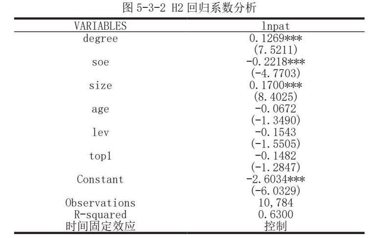 而管理层短视指标管理者教育程度degree与专利指标的相关系数为0.091,p值在0.01的水平上存在显著正相关,故支持假设H2。说明,管理者受的教育程度越高,企业创新能力越强。所以,管理层短视会在一定程度上消极影响创新,提升管理层受教育程度能增加企业的创新能力。