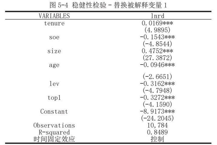 对管理层短视指标TENVRE做替换被解释变量的检验,用研发投入替换专利数量,=0.8489,拟合程度很好,在显著性水平0.01的情况下,管理层短视指标对研发支出的相关系数为0.0169,呈现显著正相关。说明管理者任期越长,用于公司研发创新的投入越多,企业创新能力越强。