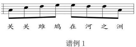 《关雎》作为标准的四言诗歌,上下句对称,这种恰当好处的平衡之美,正如中华文化所传达的和其中正思想,增强了诗歌的哲学性和艺术性。正如歌词第一句“关关雎鸠,在河之洲”,谱例如下:
