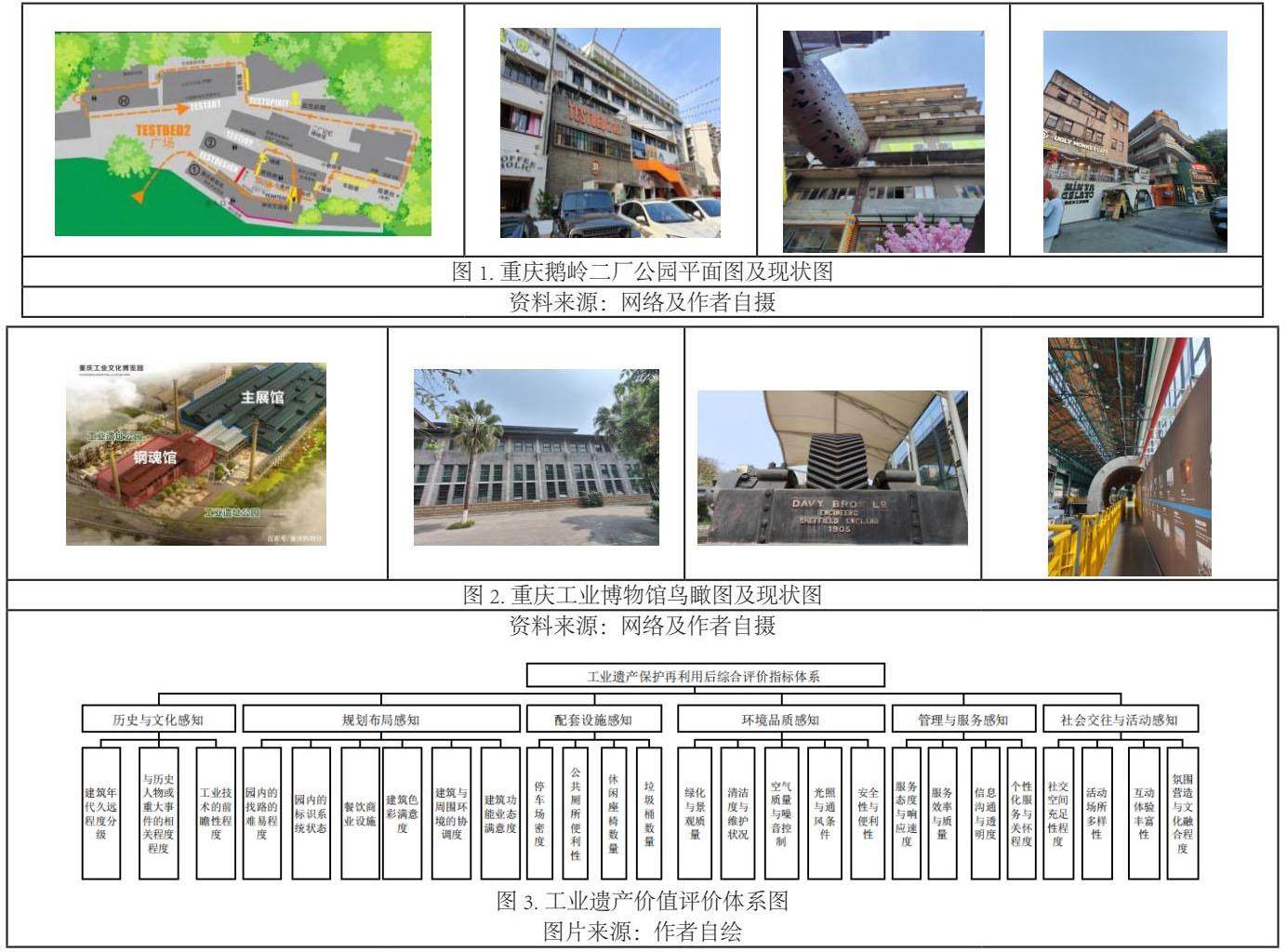 本案例选取重庆市两处比较成熟的工业遗产保护与再利用的案例-重庆鹅岭二厂(图1)和重庆大学工业博物馆(图2)。鹅岭二厂,位于重庆市渝中区鹅岭正街1号,拥有深厚的历史底蕴。作为重庆极具代表性的工业遗存之一,鹅岭二厂地理位置优越,毗邻鹅岭公园,可俯瞰长江、嘉陵江三岸的壮丽景色,在2017年12月被重庆市规划和自然资源局列为保护要素 [9]。重庆工业博物馆位于重庆市大渡口区,依托重钢原型钢厂部分工业遗存建设而成,是重庆市政府在“十二五”期间打造的重大文化设施,不仅是一个展示工业历史和文化的场所,更是一个重要的文化休闲旅游目的地。游客在这里可以深入了解重庆的工业历史和文化,感受到工业文明的独特魅力。