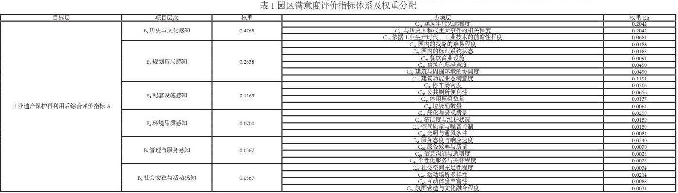 式中:Q为工业遗产再利用后满意度评价的总评分值;qij为方案层中分项环境评分值;Kij为方案层的权重;m、n分别为项目层和方案层中评价指标的个数 (表2)。