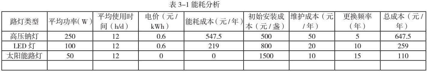 从表中可以看出,太阳能路灯的总成本最低,只有110元/年,而高压钠灯的总成本最高,达到647.5元/年。LED灯的总成本介于两者之间,为259元/年。这说明,在北京市的情况下,太阳能路灯具有最高的经济效益,而高压钠灯具有最低的经济效益。LED灯虽然也具有一定的节能优势,但是由于初始安装成本较高,其经济效益并不明显。