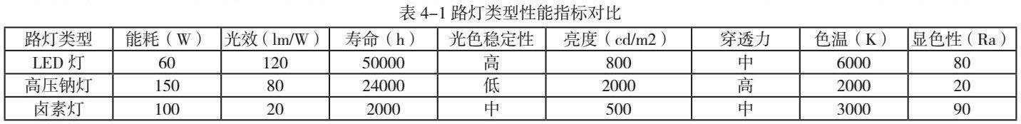 性能比较:表4-1对比了这三种路灯类型的主要性能指标,可以看出,LED灯在能耗、光效、寿命和光色稳定性方面均优于高压钠灯和卤素灯,而高压钠灯在亮度和穿透力方面优于LED灯和卤素灯,而卤素灯在色温和显色性方面优于LED灯和高压钠灯。