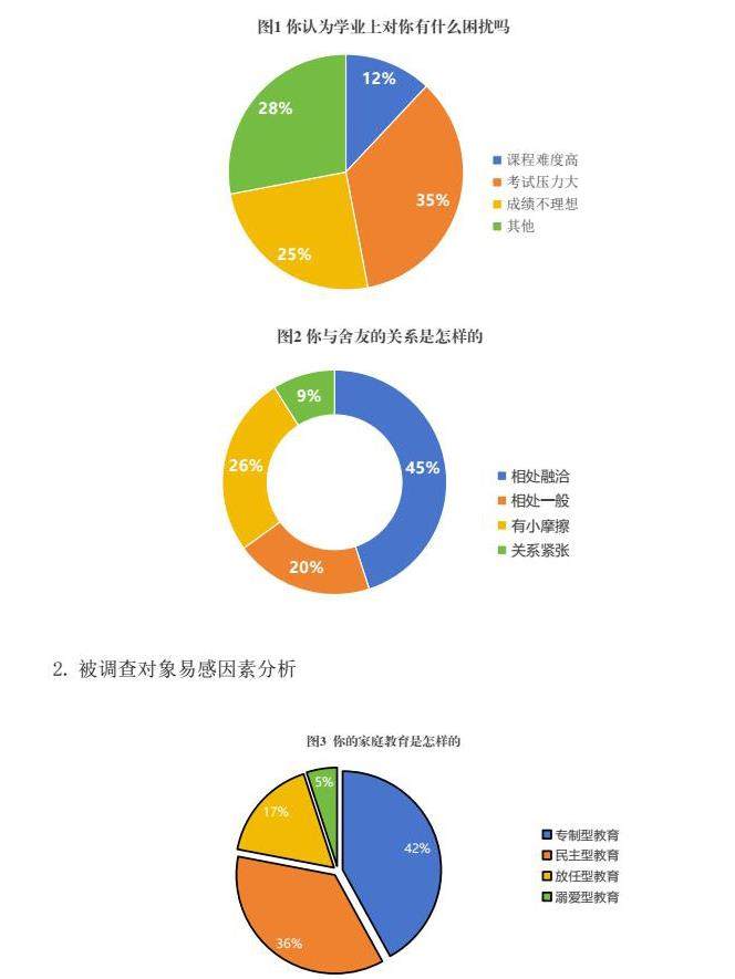 本次实验,根据分层随机抽样方法,抽取了1000名学生作为研究对象。结果显示,在学业上,约12%的学生认为课程难度高,35%表示考试带来较大压力,25%受学业成绩不理想困扰(图1);在宿舍生活上,与舍友关系融洽的学生占比45%;20%的学生与舍友相处一般;26%的学生与舍友有小摩擦;宿舍关系紧张的学生占比9%(图2)。在日常生活中,10%的学生经历家庭变故,36%有过失恋经历,15%受经济困难压力。这些应激因素相互交织,如学业压力下人际关系若不和谐,或遭遇生活事件冲击时,易使学生心理防线崩塌,可能导致焦虑、抑郁等心理危机产生,严重影响心理健康。