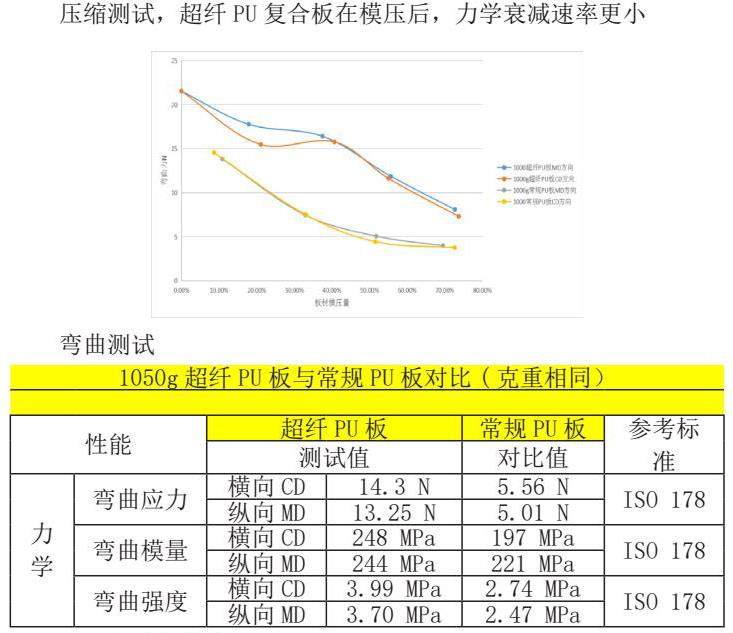 此外,本产品采用的平板复合技术和聚氨酯泡沫复合工艺也为提升力学性能、提高强度和刚性提供了技术支撑。复合工艺中的高树脂比3D毡在平板复合时,不仅提升了材料的整体强度和耐温性,还解决了传统工艺中由于玻纤含量过高导致的厚度难以控制的问题。聚氨酯泡沫的引入使得复合板材不仅轻量化,还提高了其抗冲击性和隔音效果。