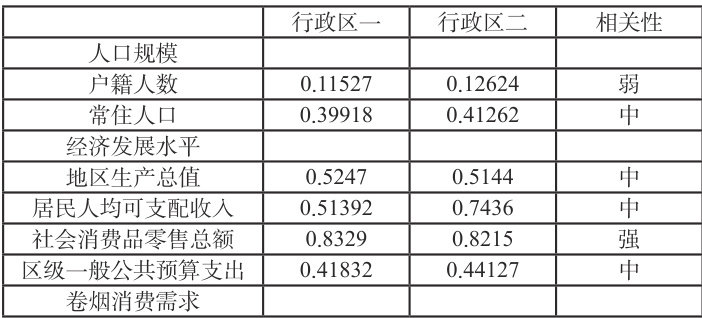 在剔除了弱相关因素之后,最终确定常住人口、地区生产总值(GDP)、居民人均可支配收入、社会消费品零售总额、区级一般公共预算支出、卷烟销售量、卷烟单箱销售额、客户毛利率等 8 个因素作为一级市场容量的测算参数。